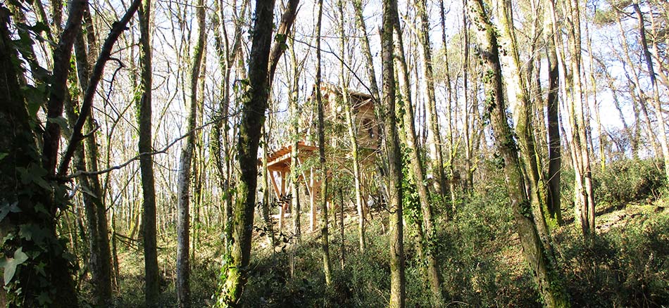 Perchée à cinq mètres de hauteur à flanc de colline, elle flotte littéralement et respire au rythme de la forêt et de ses occupants…