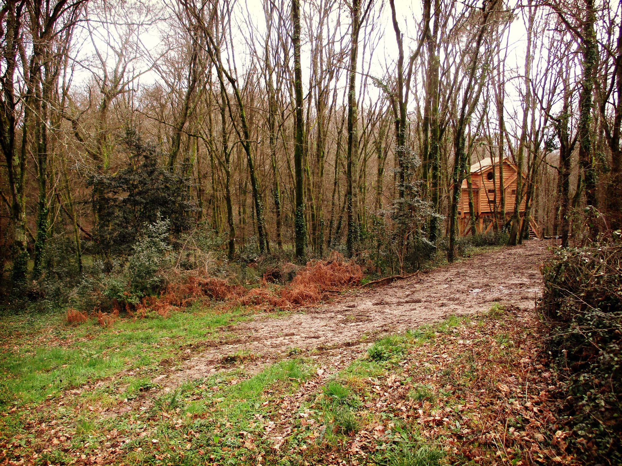L'accès se fait très simplement depuis le sentier forestier par un escalier droit. Notre cabane dispose de toilettes sèches et d'un point d'eau pour une toilette de chat. Reliée au réseau électrique.